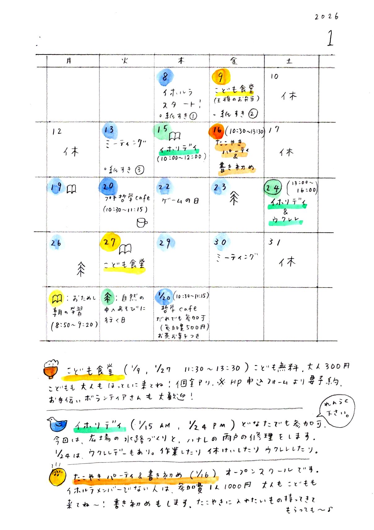 イホルラ舎 2026年1月のカレンダー 投稿日 2026年1月6日 著者 ihorula-admin カテゴリー お知らせ あけましておめでとうございます。2026年1月のカレンダーです。2026年1月の活動予定(jpg) カレンダー